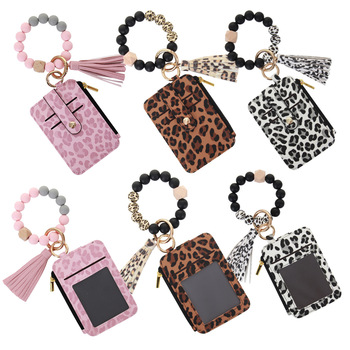 Portachiavi con carta di credito Multi-slot con stampa leopardata alla moda Portachiavi portamonete in Silicone con perline in pelle