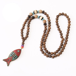 Vintage el yapımı uzun bildirimi kolye takı Nepal budist Mala ahşap boncuk balık kolye kolye